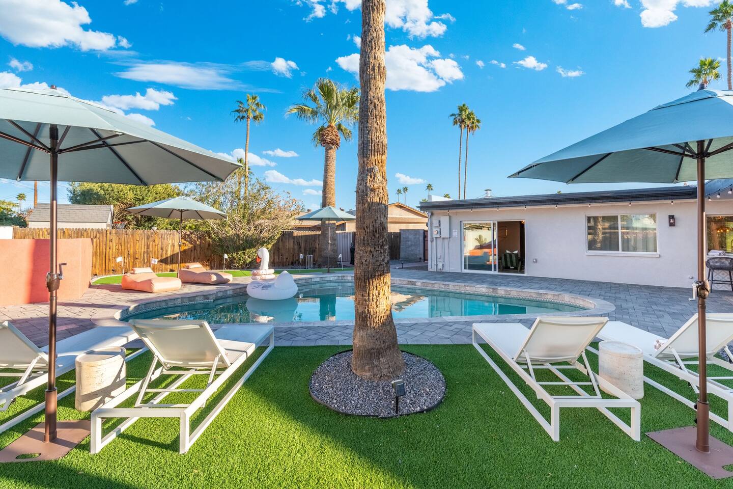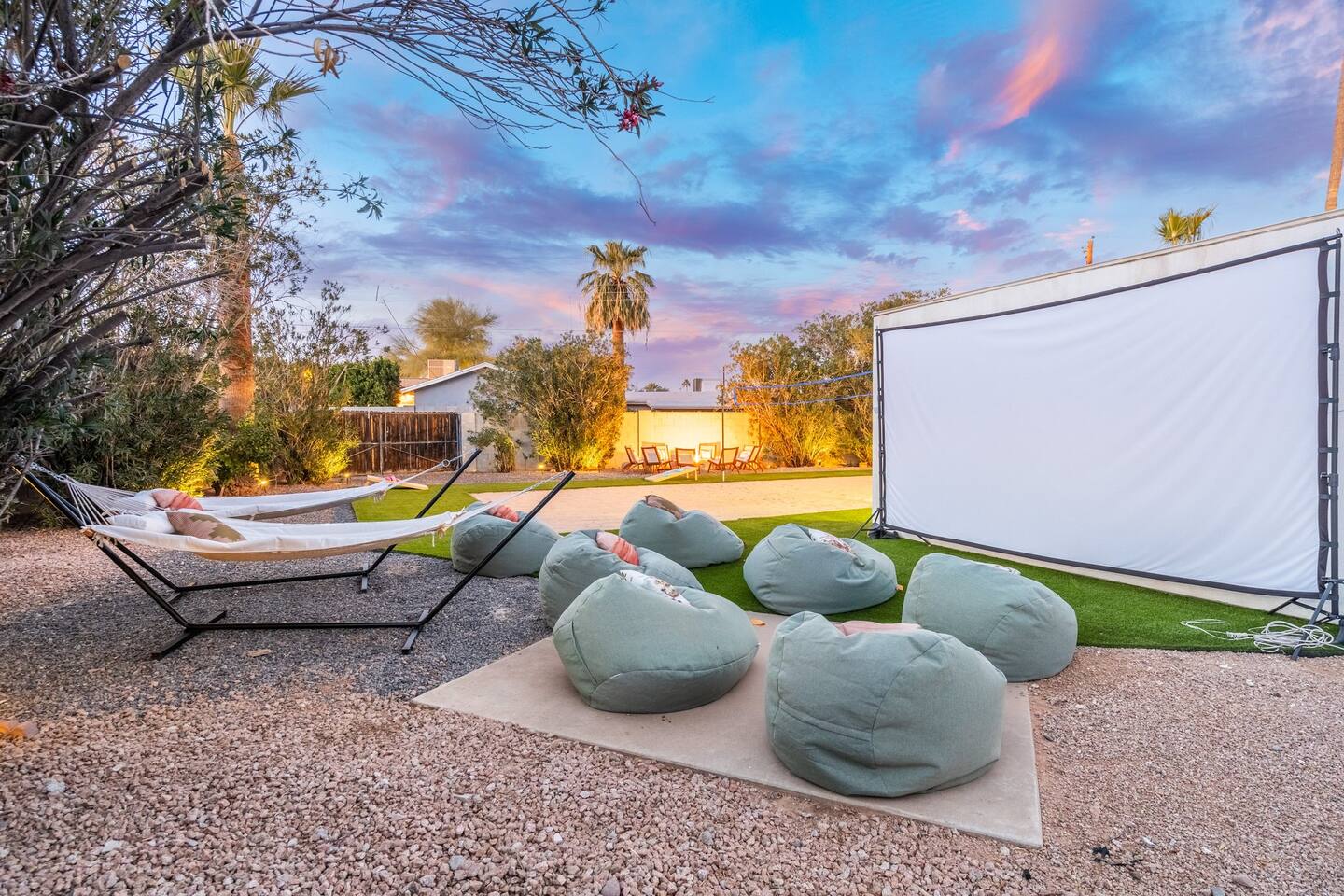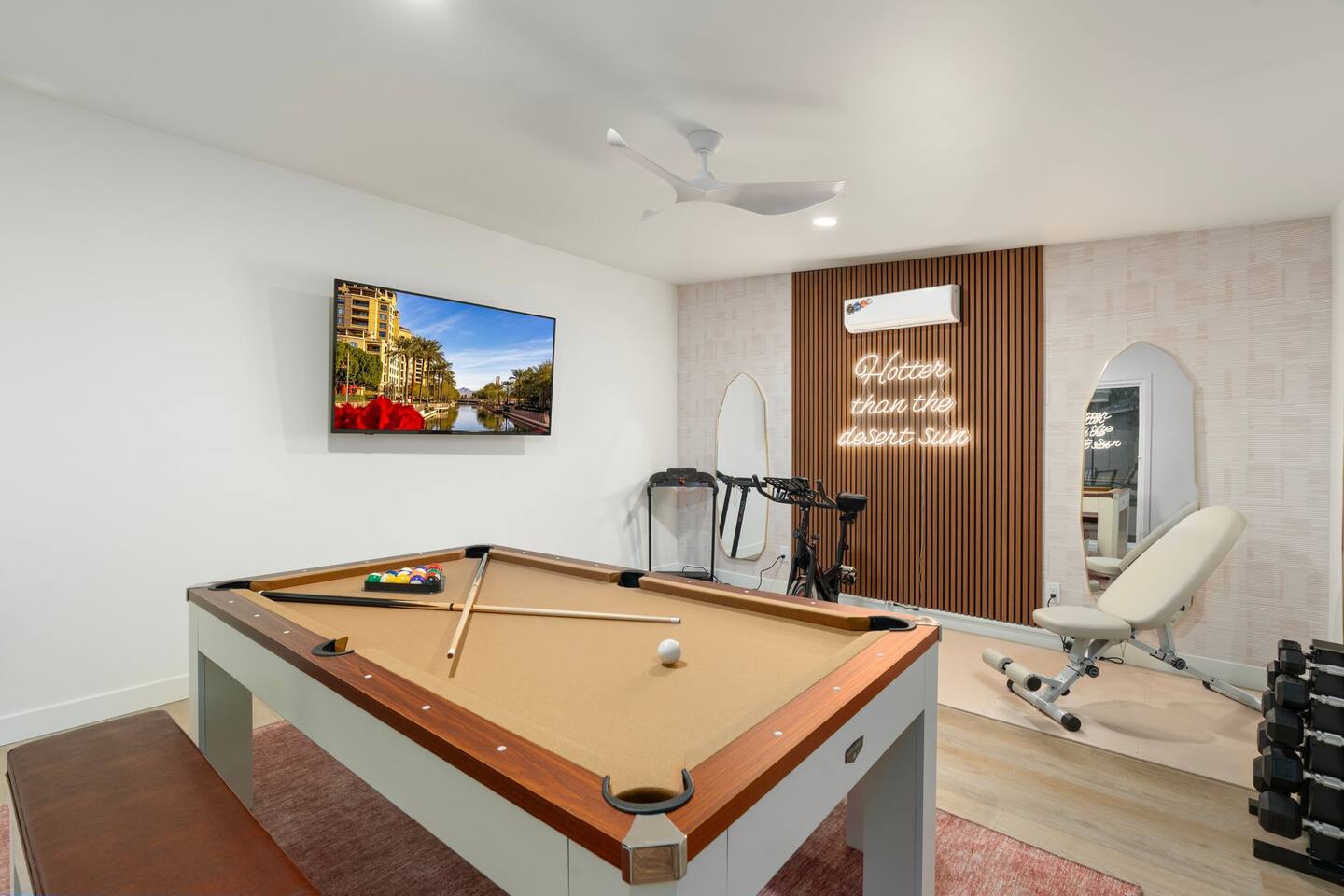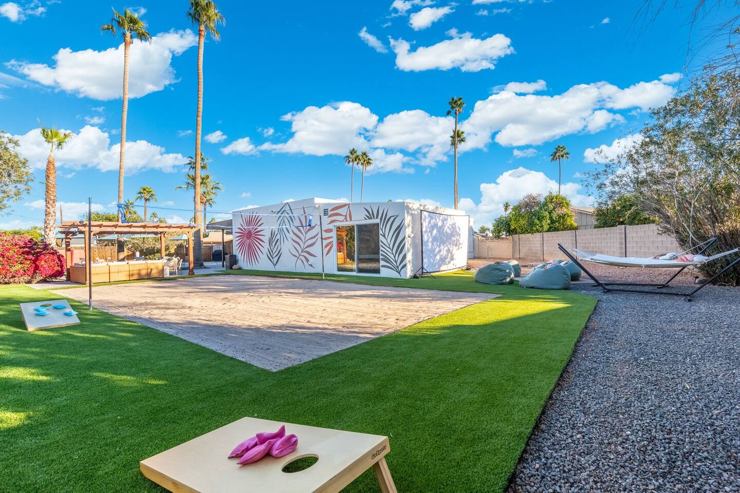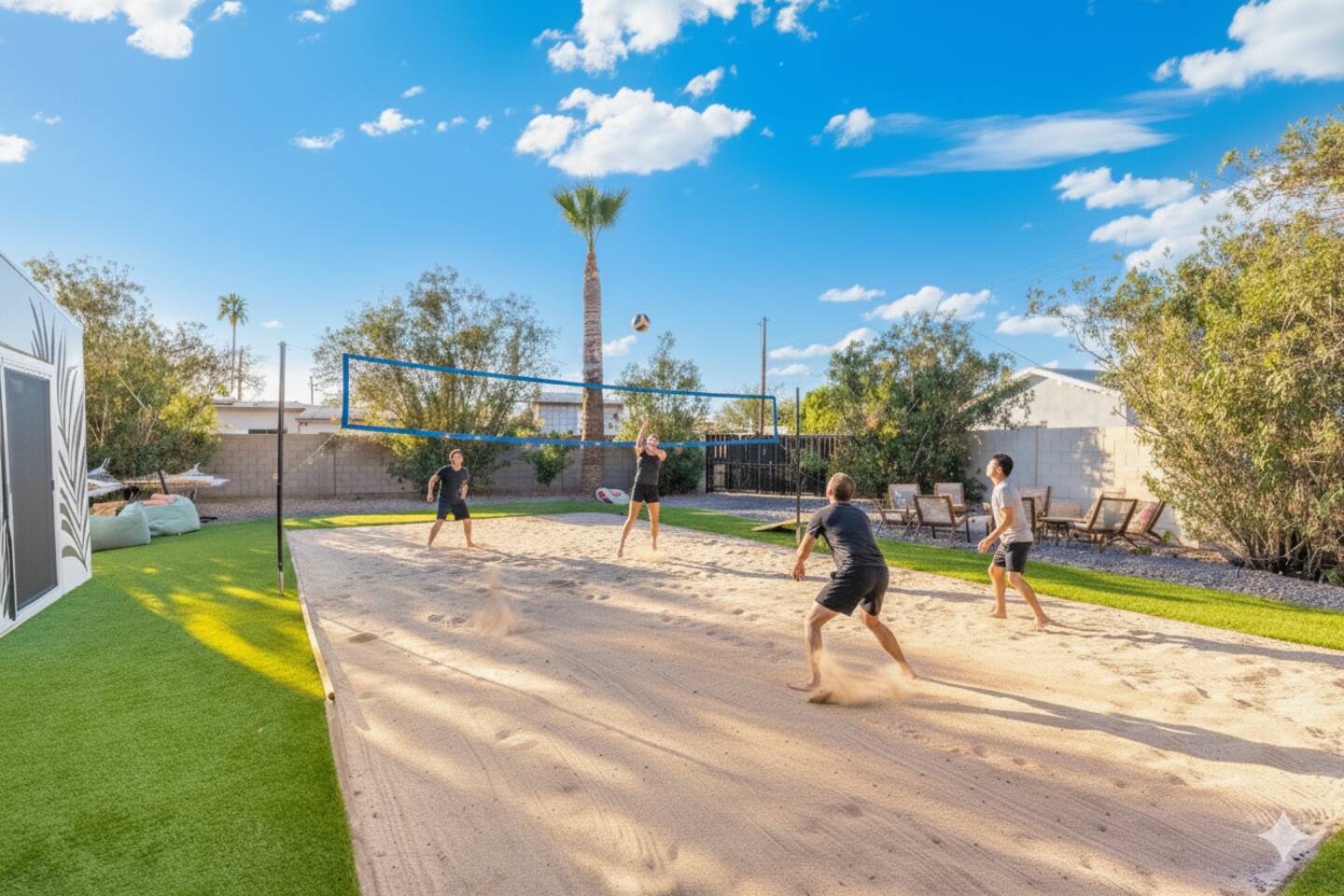 Bask in the Arizona sun and enjoy the stunning amenities of this private Scottsdale oasis, thoughtfully designed for family retreats and group getaways. INTERIOR HIGHLIGHTS - 5 Bedrooms, 3 Bathrooms: Includes a fun bunk room perfect for groups. - Sleeps 16: 2 Kings, 1 Queen, 2 full, and 2 full bunks - Fully-Stocked Kitchen: Features a coffee bar, modern appliances, and seating for 10 at the dining table. - Gym/Game Room: Equipped with a pool table, treadmill, weights, and yoga mats for wellness and fun. OUTDOOR PARADISE -Heated Pool: Available for an additional charge of $250 for 2–5 day stays. For stays longer than 5 days, the price may vary. Pool towels and floats are provided. -Outdoor Movie Theater: Enjoy your favorite films under the stars, complete with cozy hammocks and beanbags for the ultimate outdoor lounging experience. -Private Volleyball Court: Scottsdale’s only beach-style sand court -- a highlight for groups and families. -Mini Golf & Backyard Games: Entertainment for all ages. -Fire Pit Lounge: Perfect for starlit conversations and desert evenings. -Outdoor Bar + Dining Area: Includes grill, dining table, and shaded lounge seating -- ideal for weekend barbecues or celebrations.