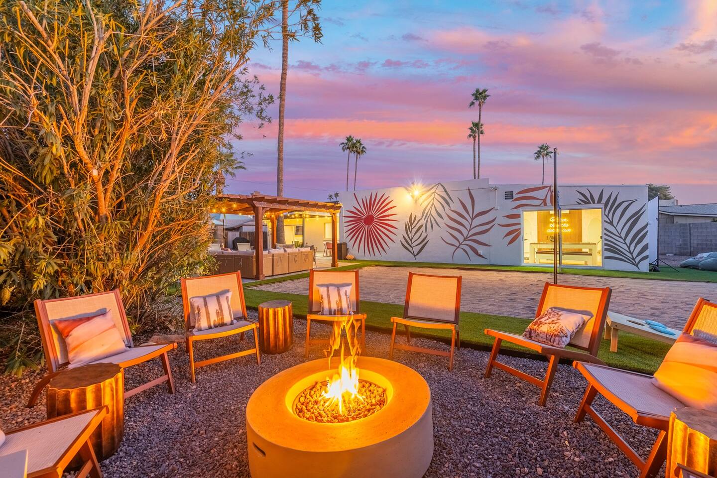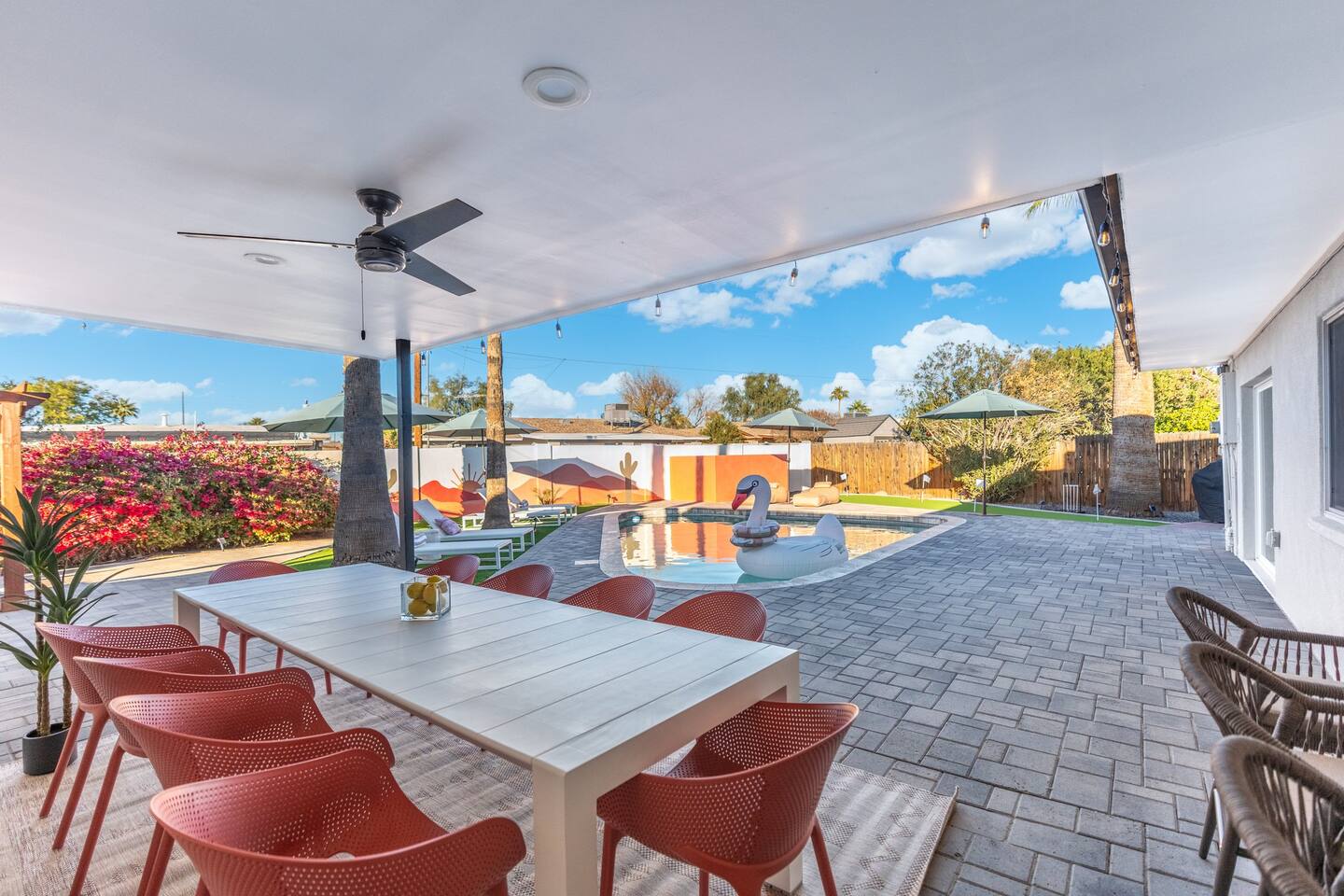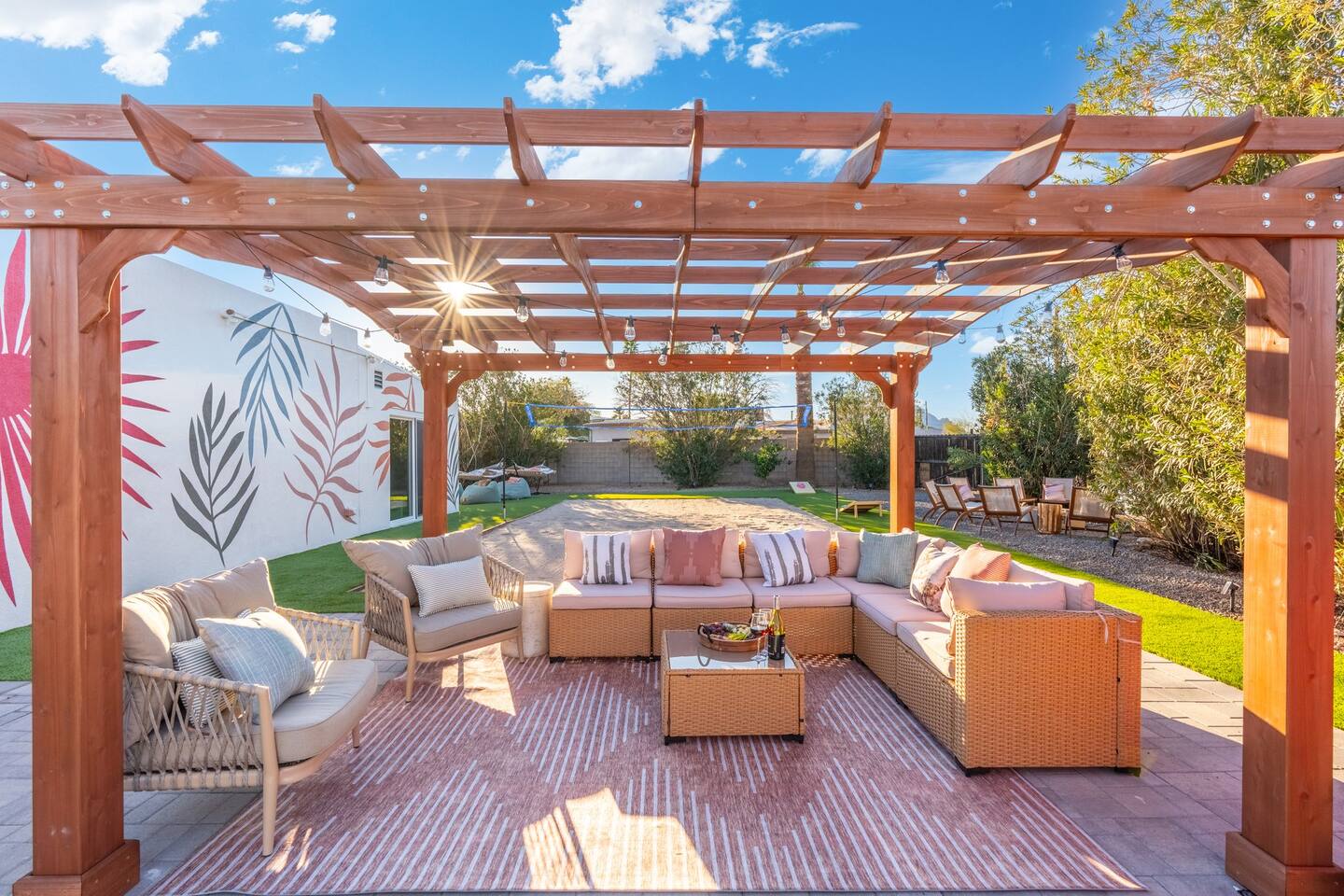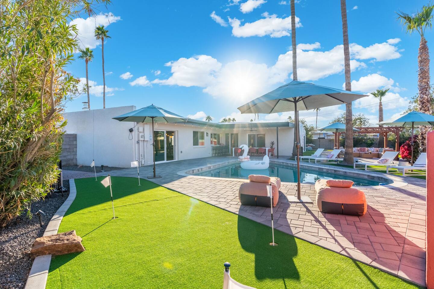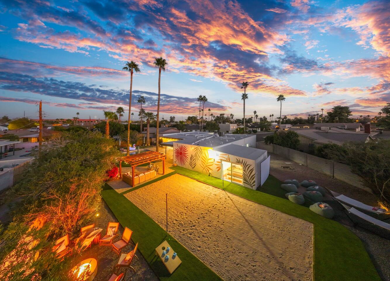 Bask in the Arizona sun and enjoy the stunning amenities of this private Scottsdale oasis, thoughtfully designed for family retreats and group getaways. INTERIOR HIGHLIGHTS - 5 Bedrooms, 3 Bathrooms: Includes a fun bunk room perfect for groups. - Sleeps 16: 2 Kings, 1 Queen, 2 full, and 2 full bunks - Fully-Stocked Kitchen: Features a coffee bar, modern appliances, and seating for 10 at the dining table. - Gym/Game Room: Equipped with a pool table, treadmill, weights, and yoga mats for wellness and fun. OUTDOOR PARADISE -Heated Pool: Available for an additional charge of $250 for 2–5 day stays. For stays longer than 5 days, the price may vary. Pool towels and floats are provided. -Outdoor Movie Theater: Enjoy your favorite films under the stars, complete with cozy hammocks and beanbags for the ultimate outdoor lounging experience. -Private Volleyball Court: Scottsdale’s only beach-style sand court -- a highlight for groups and families. -Mini Golf & Backyard Games: Entertainment for all ages. -Fire Pit Lounge: Perfect for starlit conversations and desert evenings. -Outdoor Bar + Dining Area: Includes grill, dining table, and shaded lounge seating -- ideal for weekend barbecues or celebrations.