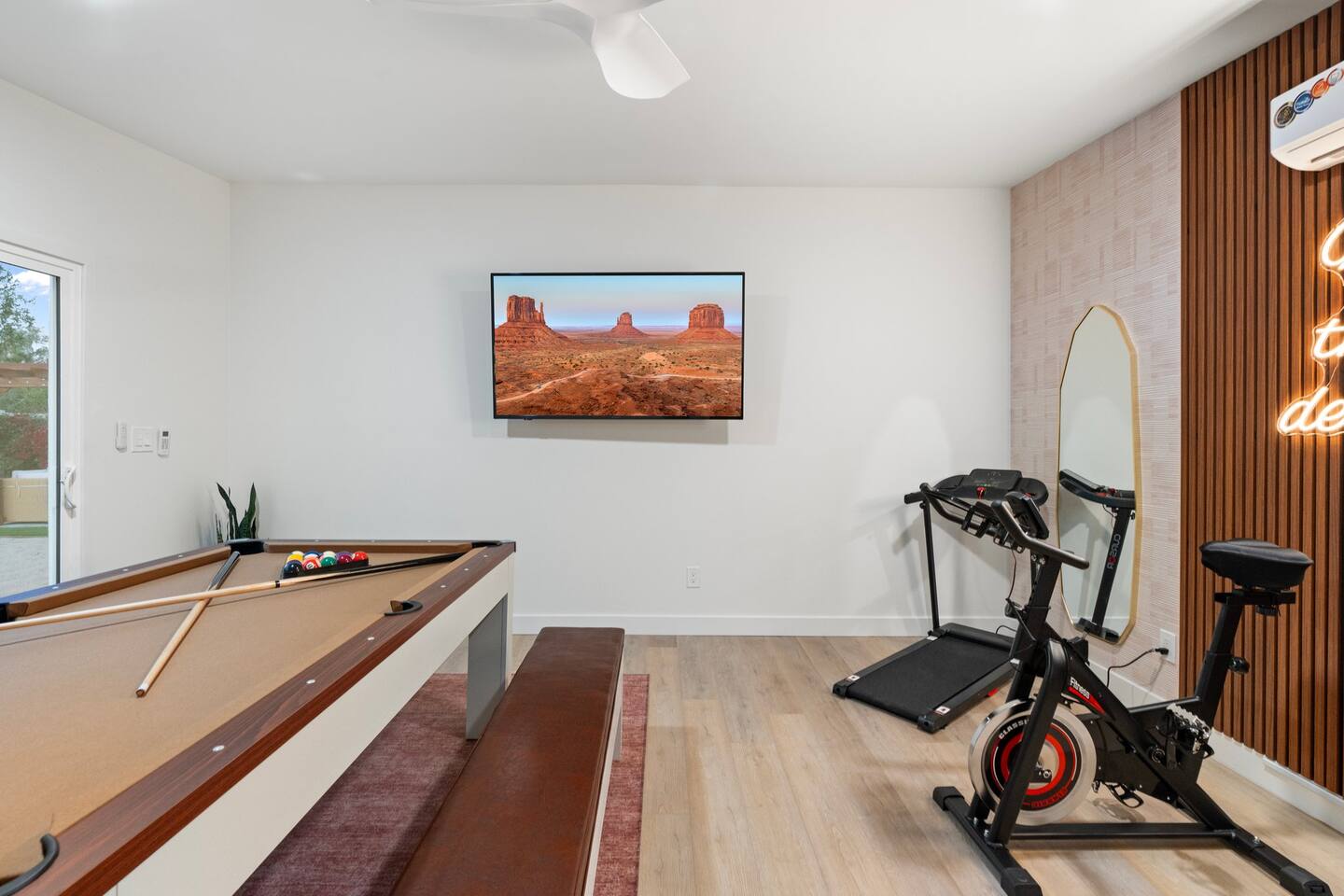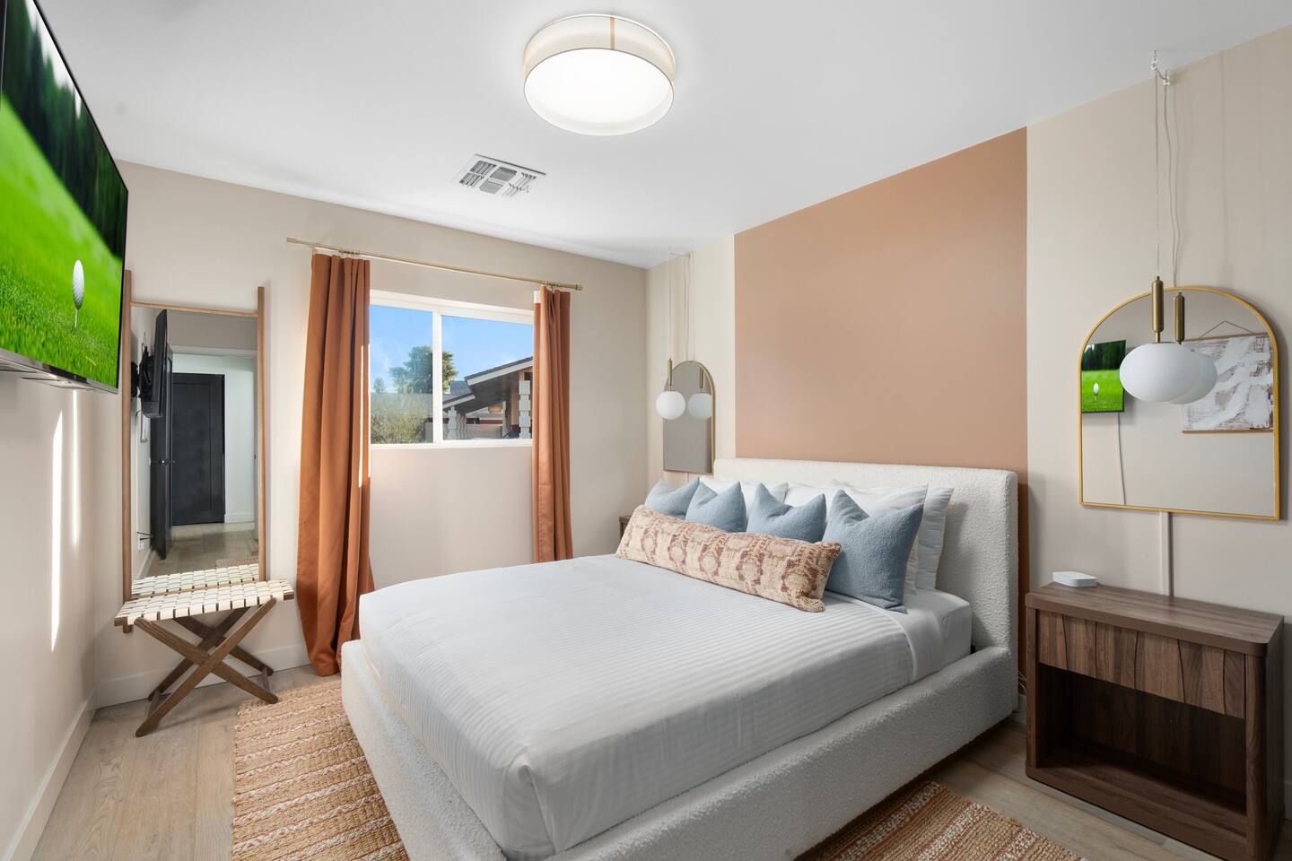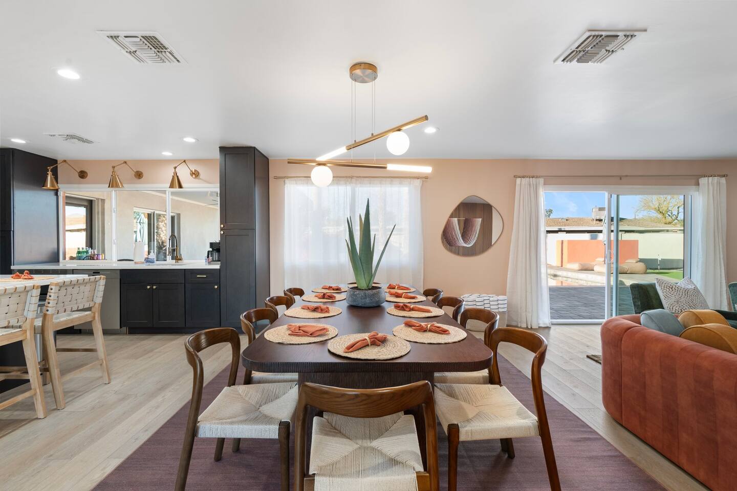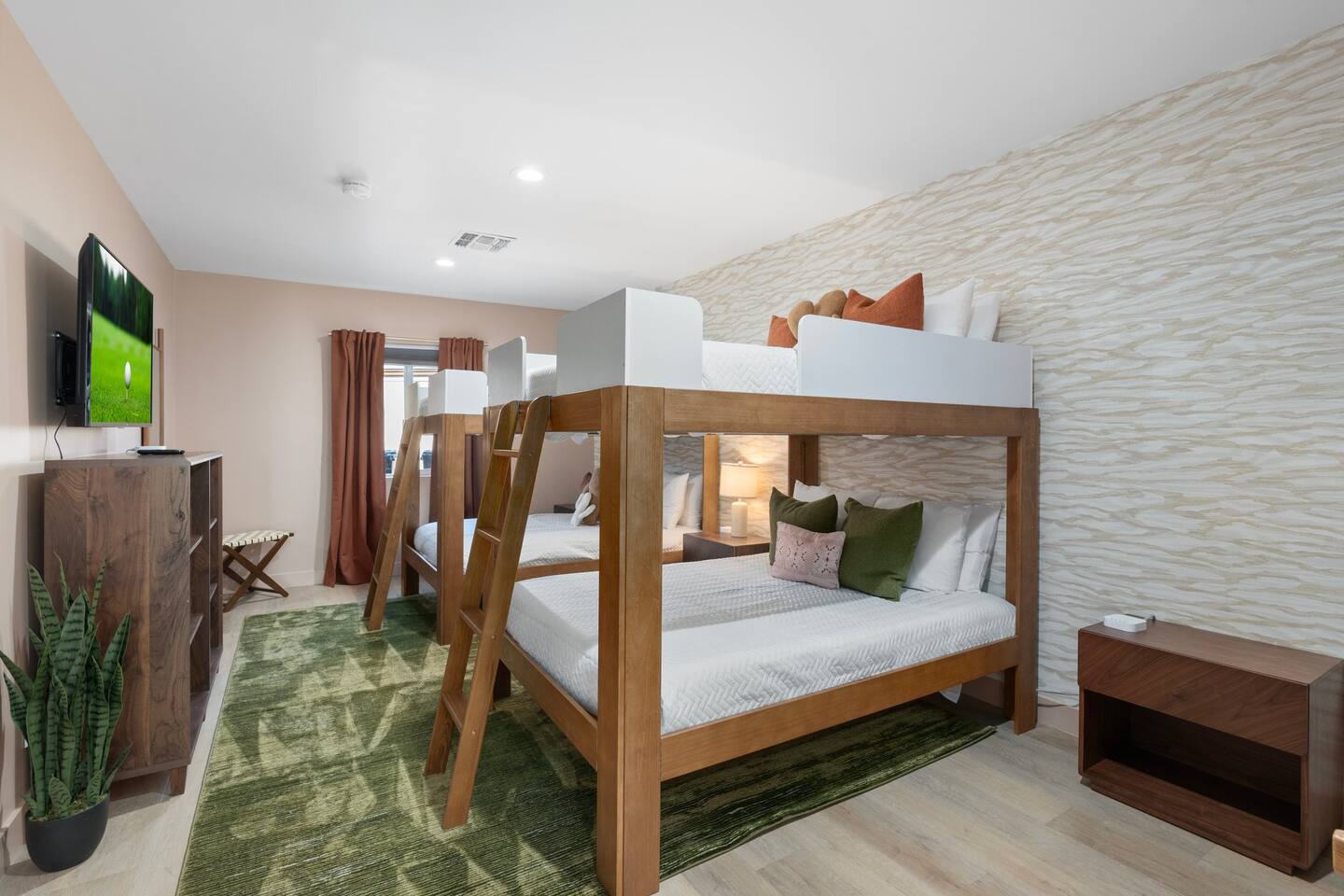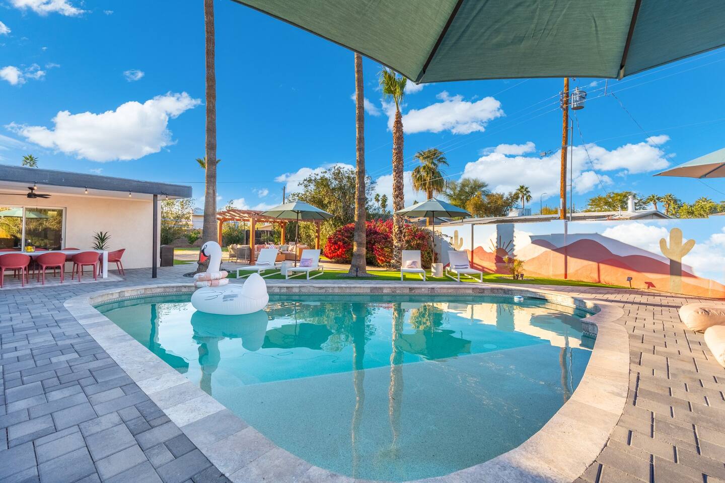 Bask in the Arizona sun and enjoy the stunning amenities of this private Scottsdale oasis, thoughtfully designed for family retreats and group getaways. INTERIOR HIGHLIGHTS - 5 Bedrooms, 3 Bathrooms: Includes a fun bunk room perfect for groups. - Sleeps 16: 2 Kings, 1 Queen, 2 full, and 2 full bunks - Fully-Stocked Kitchen: Features a coffee bar, modern appliances, and seating for 10 at the dining table. - Gym/Game Room: Equipped with a pool table, treadmill, weights, and yoga mats for wellness and fun. OUTDOOR PARADISE -Heated Pool: Available for an additional charge of $250 for 2–5 day stays. For stays longer than 5 days, the price may vary. Pool towels and floats are provided. -Outdoor Movie Theater: Enjoy your favorite films under the stars, complete with cozy hammocks and beanbags for the ultimate outdoor lounging experience. -Private Volleyball Court: Scottsdale’s only beach-style sand court -- a highlight for groups and families. -Mini Golf & Backyard Games: Entertainment for all ages. -Fire Pit Lounge: Perfect for starlit conversations and desert evenings. -Outdoor Bar + Dining Area: Includes grill, dining table, and shaded lounge seating -- ideal for weekend barbecues or celebrations.