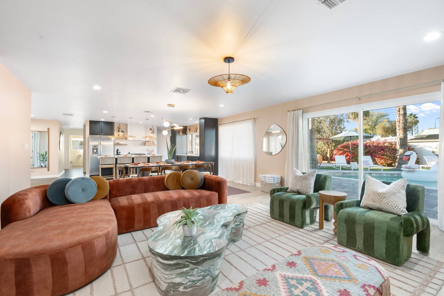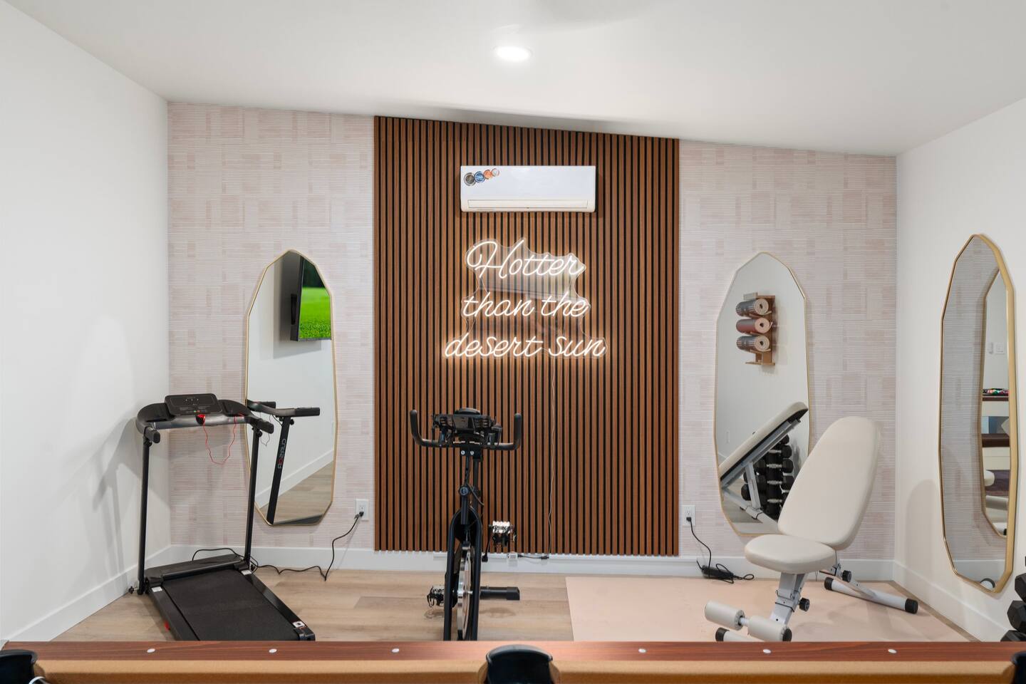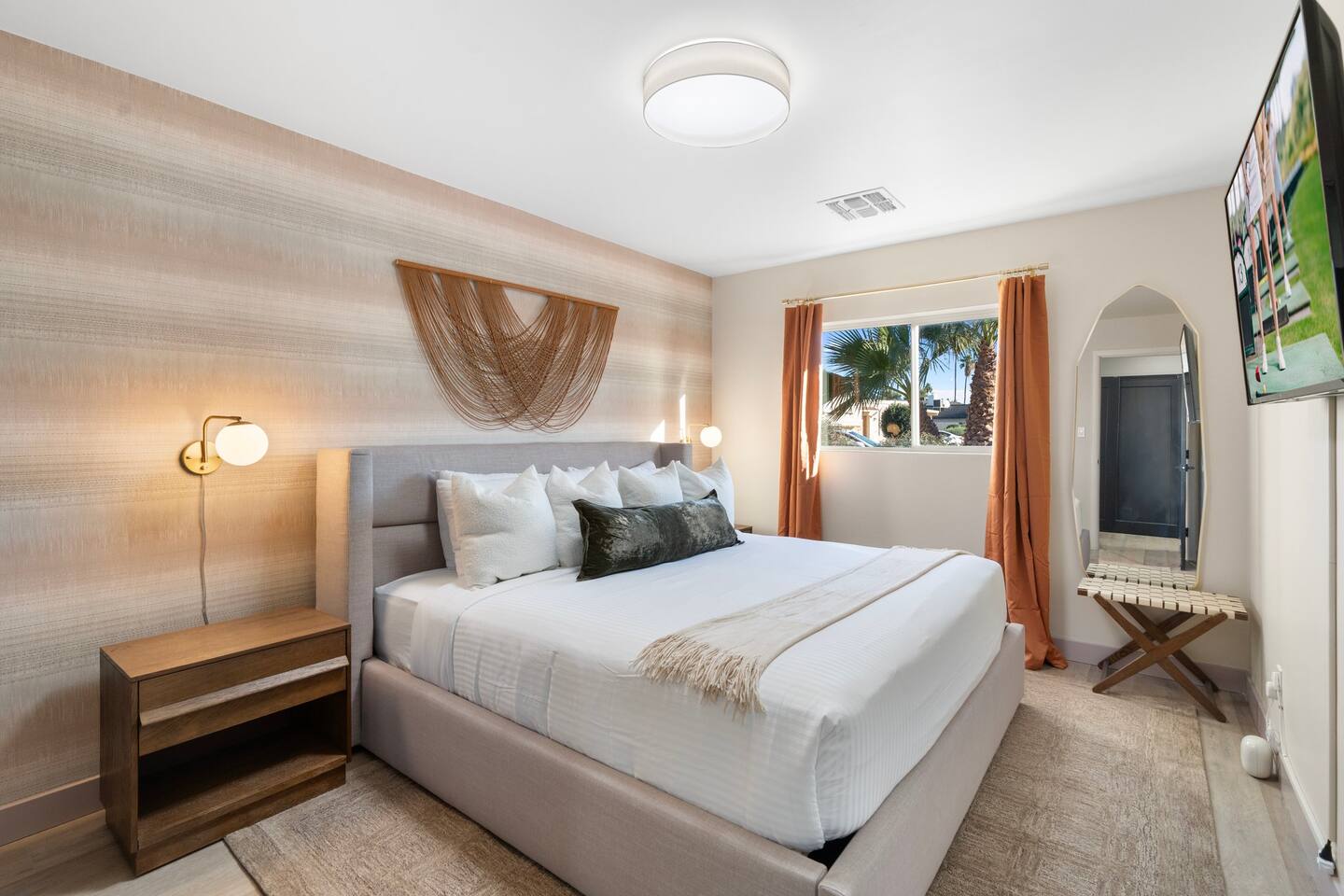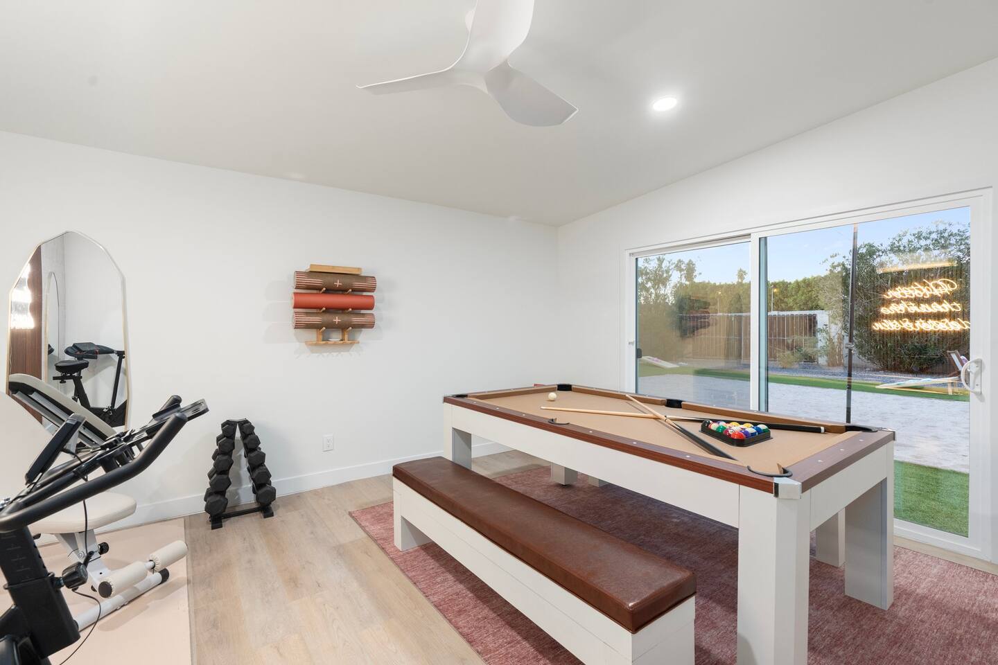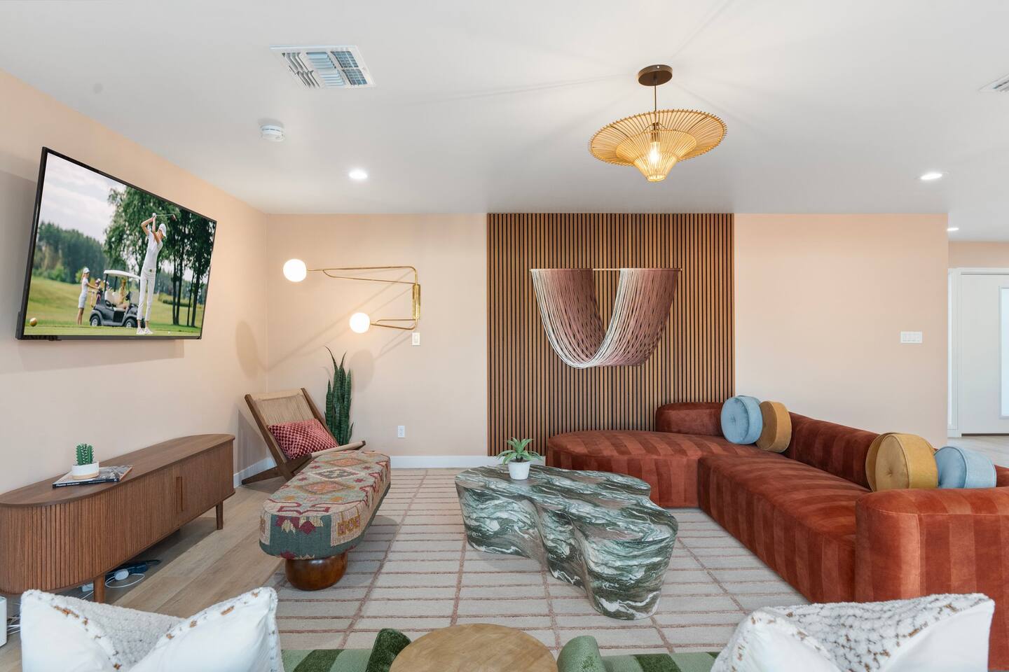 Bask in the Arizona sun and enjoy the stunning amenities of this private Scottsdale oasis, thoughtfully designed for family retreats and group getaways. INTERIOR HIGHLIGHTS - 5 Bedrooms, 3 Bathrooms: Includes a fun bunk room perfect for groups. - Sleeps 16: 2 Kings, 1 Queen, 2 full, and 2 full bunks - Fully-Stocked Kitchen: Features a coffee bar, modern appliances, and seating for 10 at the dining table. - Gym/Game Room: Equipped with a pool table, treadmill, weights, and yoga mats for wellness and fun. OUTDOOR PARADISE -Heated Pool: Available for an additional charge of $250 for 2–5 day stays. For stays longer than 5 days, the price may vary. Pool towels and floats are provided. -Outdoor Movie Theater: Enjoy your favorite films under the stars, complete with cozy hammocks and beanbags for the ultimate outdoor lounging experience. -Private Volleyball Court: Scottsdale’s only beach-style sand court -- a highlight for groups and families. -Mini Golf & Backyard Games: Entertainment for all ages. -Fire Pit Lounge: Perfect for starlit conversations and desert evenings. -Outdoor Bar + Dining Area: Includes grill, dining table, and shaded lounge seating -- ideal for weekend barbecues or celebrations.